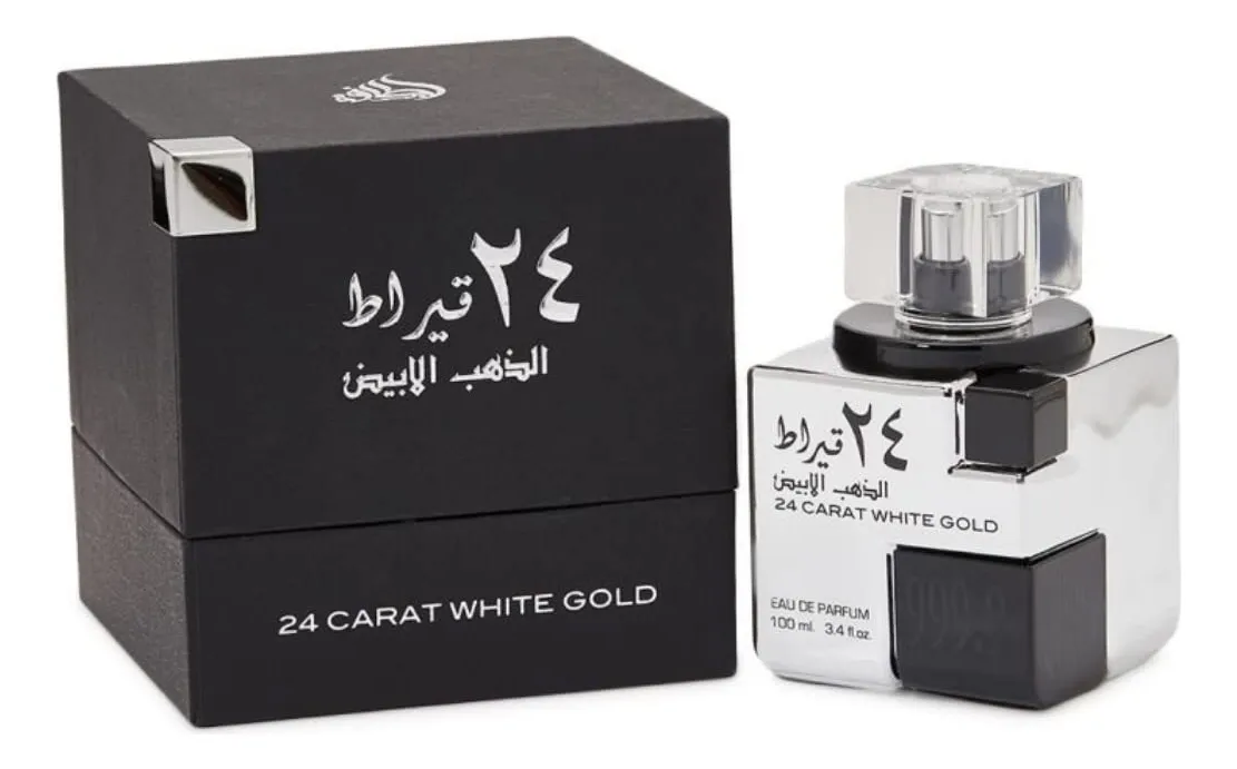 24 Carat White Gold de Lattafa Perfumes es una fragancia de la familia olfativa Oriental para Hombres y Mujeres. Las Notas de Salida son bergamota y flor de azahar del naranjo; las Notas de Corazón son lavanda, pimienta rosa, geranio y nuez moscada; las Notas de Fondo son vetiver, madera de oud y haba tonka.