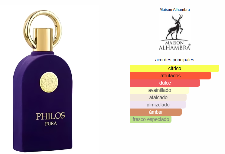 Philos Pura de Maison Alhambra es una fragancia de la familia olfativa Aromática Frutal para Hombres y Mujeres. Philos Pura se lanzó en 2022. Las Notas de Salida son naranja, bergamota y limón (lima ácida); la Nota de Corazón es frutas; las Notas de Fondo son vainilla de Madagascar, almizcle blanco y ámbar.