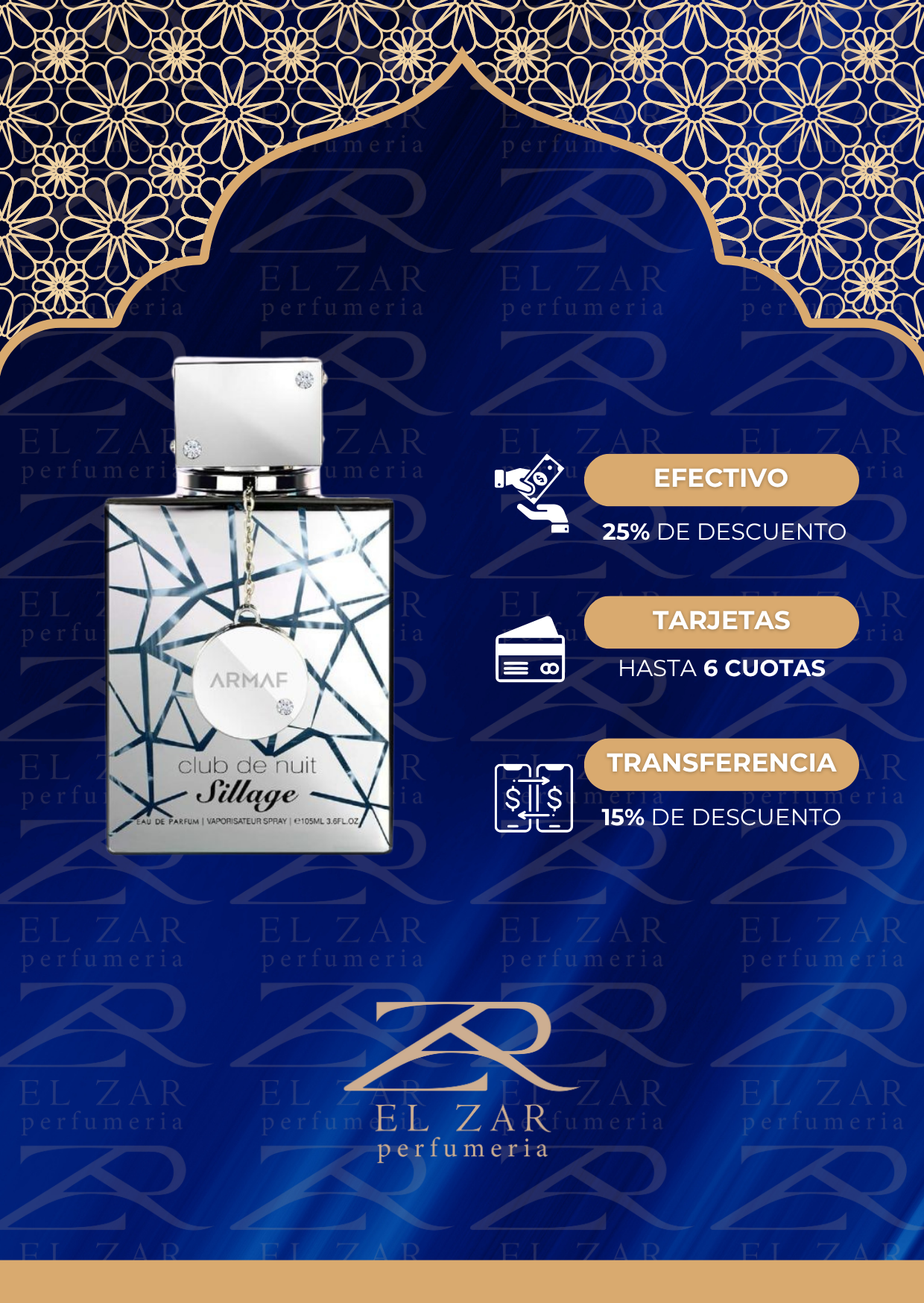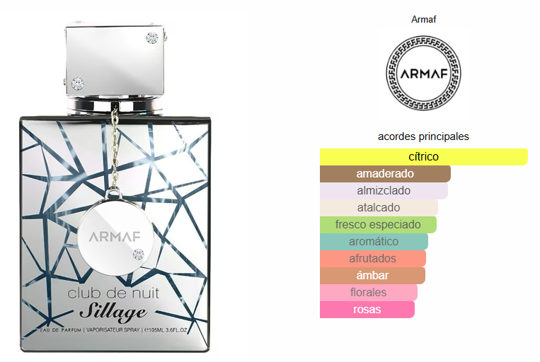 Club de Nuit Sillage de Armaf es una fragancia de la familia olfativa Almizcle Floral Amaderado para Hombres y Mujeres. Club de Nuit Sillage se lanzó en 2020. Las Notas de Salida son bergamota, limón (lima ácida), lima (limón verde), grosellas negras, hojas de violeta y jengibre; las Notas de Corazón son rosa, iris y jazmín; las Notas de Fondo son ambroxan, almizcle, sándalo y cedro.