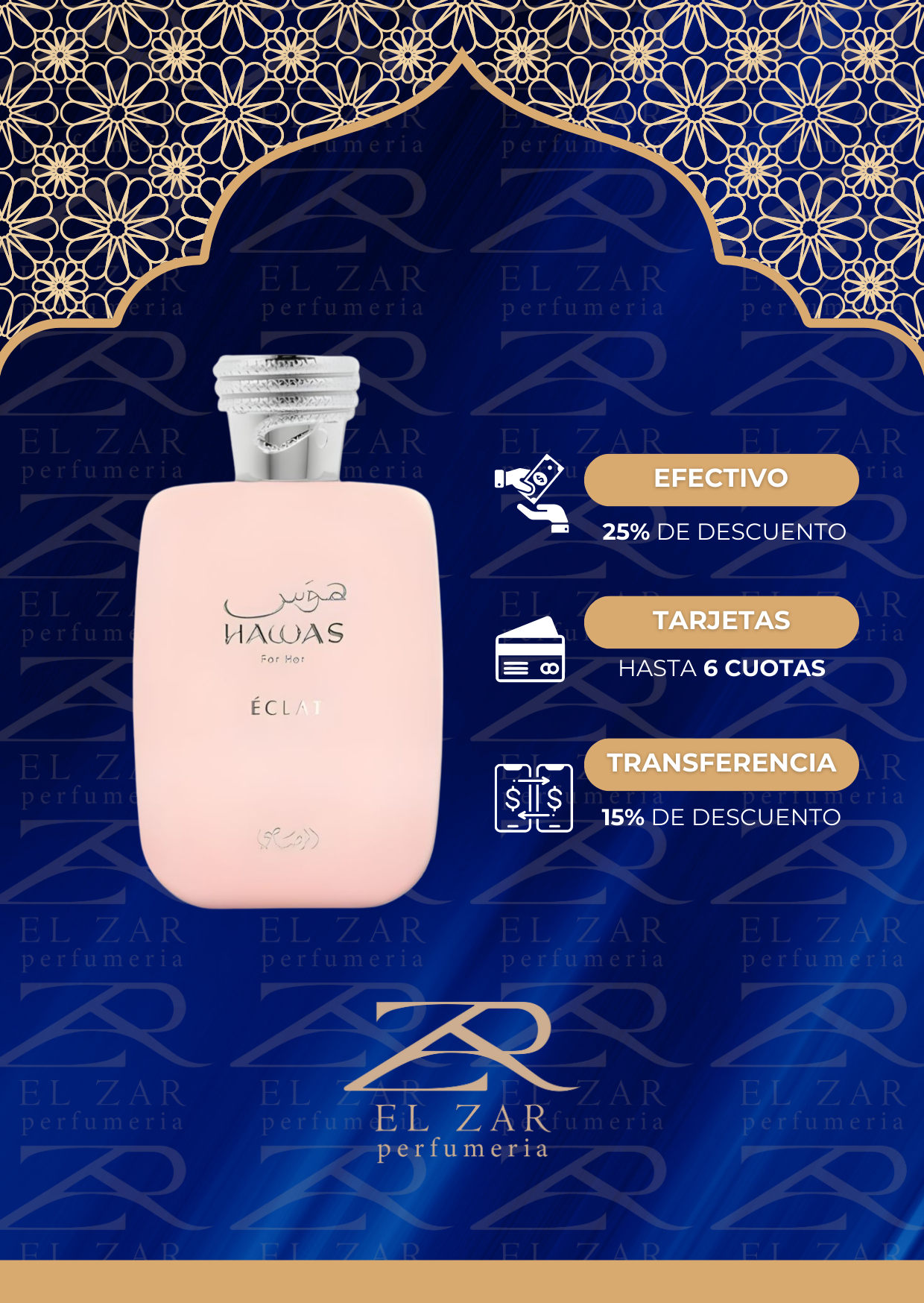 Hawas For Her Éclat de Rasasi es una fragancia floral oriental para mujer. La fragancia está a cargo de Amandine Galliano. Las notas de salida son lichi, pera, bergamota y pistacho; las notas de corazón, rosa e incienso; y las notas de fondo, vainilla, almizcle, ámbar y notas amaderadas