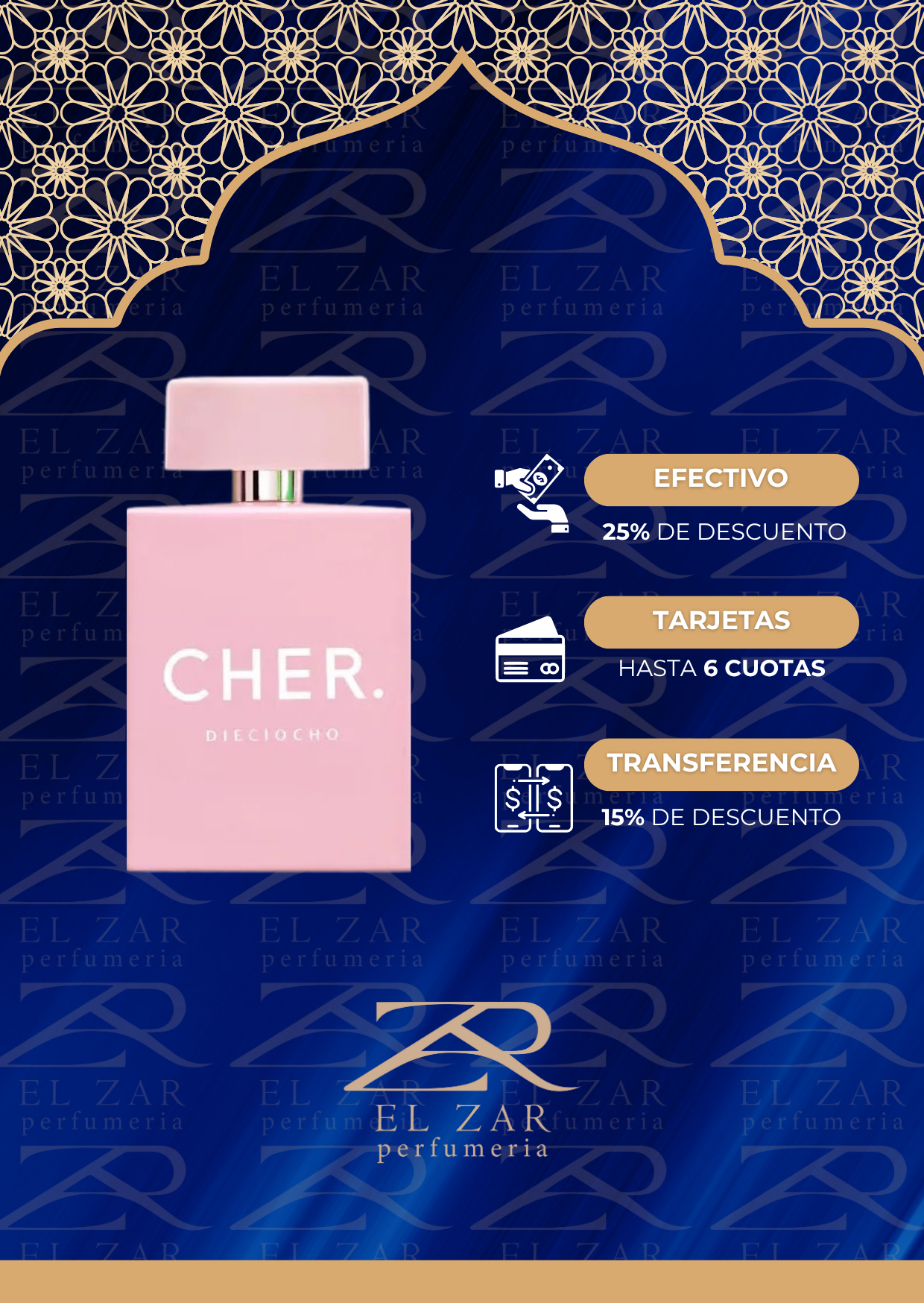 Cher Dieciocho es una popular línea de fragancias de la marca argentina Cher, conocida por su aroma floral y gourmand que evoca el glamour de Los Ángeles, destacándose por sus notas de salida de gardenia, mandarina y naranja; corazón de miel, jazmín, azahar y durazno; y fondo de pachulí, cera de abeja y caramelo.