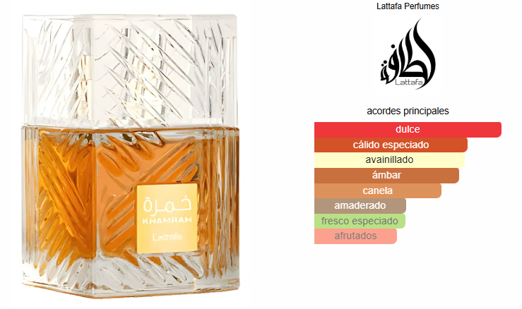 Khamrah de Lattafa Perfumes es una fragancia de la familia olfativa Oriental Especiada para Hombres y Mujeres. Esta fragrancia es nueva. Khamrah se lanzó en 2022. Las Notas de Salida son canela, nuez moscada y bergamota; las Notas de Corazón son dátiles, praliné, nardos y Mahonial; las Notas de Fondo son vainilla, haba tonka, Amberwood, mirra, benjuí y Akigalawood