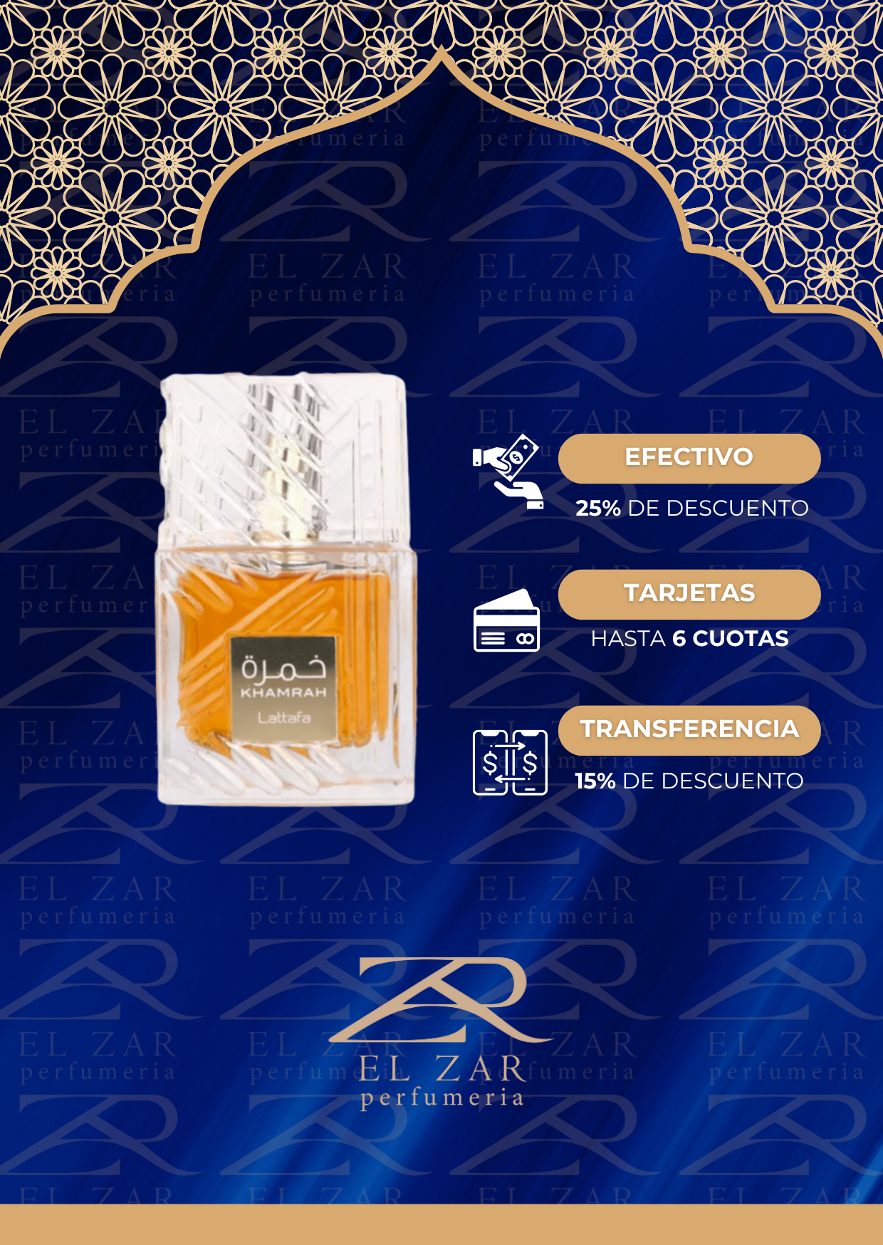 Khamrah de Lattafa Perfumes es una fragancia de la familia olfativa Oriental Especiada para Hombres y Mujeres. Esta fragrancia es nueva. Khamrah se lanzó en 2022. Las Notas de Salida son canela, nuez moscada y bergamota; las Notas de Corazón son dátiles, praliné, nardos y Mahonial; las Notas de Fondo son vainilla, haba tonka, Amberwood, mirra, benjuí y Akigalawood