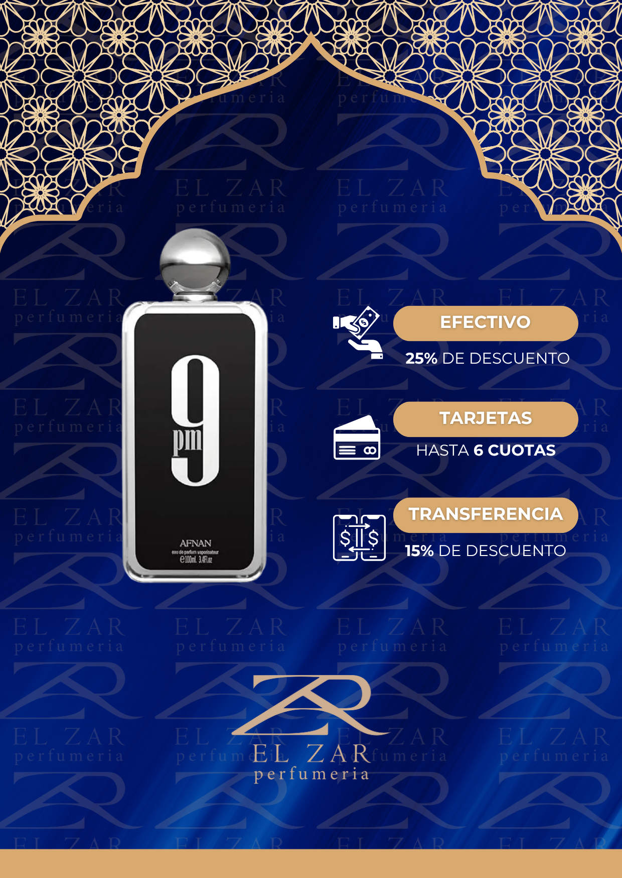 9pm de Afnan es una fragancia de la familia olfativa Oriental Vainilla para Hombres. 9pm se lanzó en 2020. Las Notas de Salida son manzana, canela, lavanda silvestre y bergamota; las Notas de Corazón son flor de azahar del naranjo y lirio de los valles (muguete); las Notas de Fondo son vainilla, haba tonka, ámbar y pachulí.