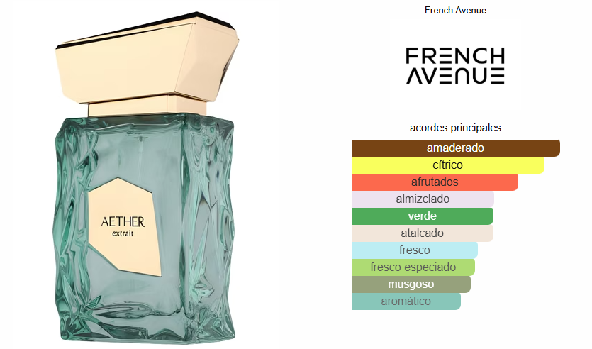 Aether de French Avenue es una fragancia de la familia olfativa Aromática Frutal para Hombres y Mujeres. Esta fragrancia es nueva. Aether se lanzó en 2024. Las Notas de Salida son manzana verde, bergamota y mandarina; las Notas de Corazón son cedro, petit grain, cachemira y violeta; las Notas de Fondo son almizcle, musgo de roble y Amberwood.