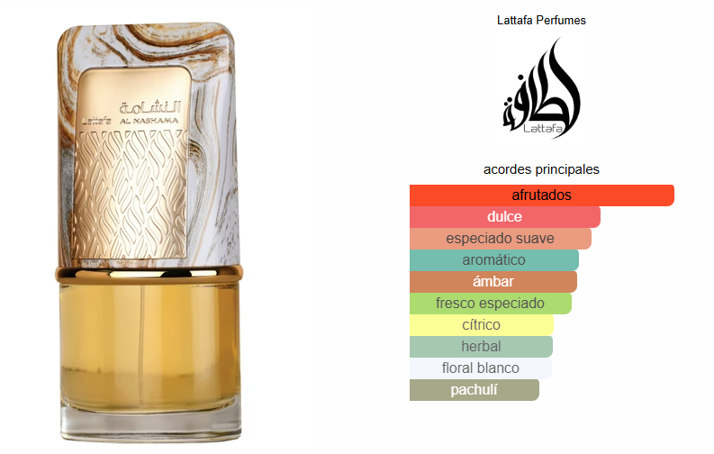 Al Nashama de Lattafa Perfumes es una fragancia de la familia olfativa para Hombres y Mujeres. Esta fragrancia es nueva. Al Nashama se lanzó en 2024. Las Notas de Salida son salvia, pimienta rosa y bergamota; las Notas de Corazón son ciruela, jazmín y pimienta negra; las Notas de Fondo son Cuero Saffiano, ámbar, pachulí y musgo.