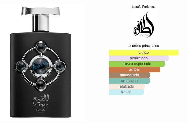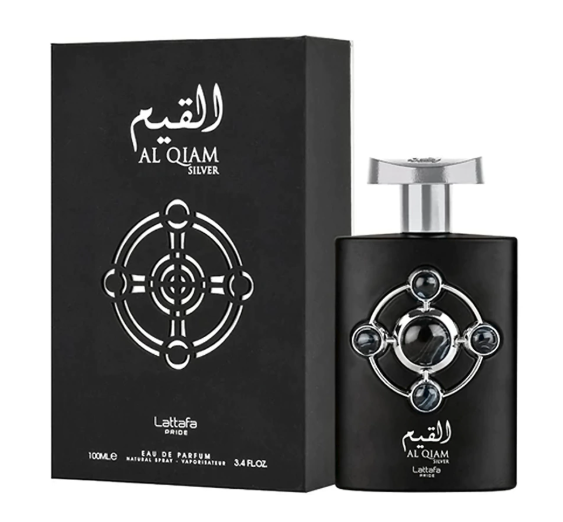 Al Qiam Silver de Lattafa Perfumes es una fragancia de la familia olfativa para Hombres y Mujeres. Al Qiam Silver se lanzó en 2022. Las Notas de Salida son toronja (pomelo) y jengibre; las Notas de Corazón son ambroxan y sándalo; las Notas de Fondo son almizcle y vetiver.