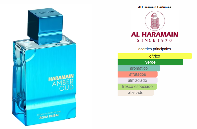 Amber Oud Aqua Dubai de Al Haramain Perfumes es una fragancia de la familia olfativa Aromática Frutal para Hombres y Mujeres. Esta fragrancia es nueva. Amber Oud Aqua Dubai se lanzó en 2024. Las Notas de Salida son bergamota, notas verdes y mandarina; las Notas de Corazón son ámbar, melón, grosellas negras y piña; las Notas de Fondo son almizcle, petit grain, gálbano y vainilla.