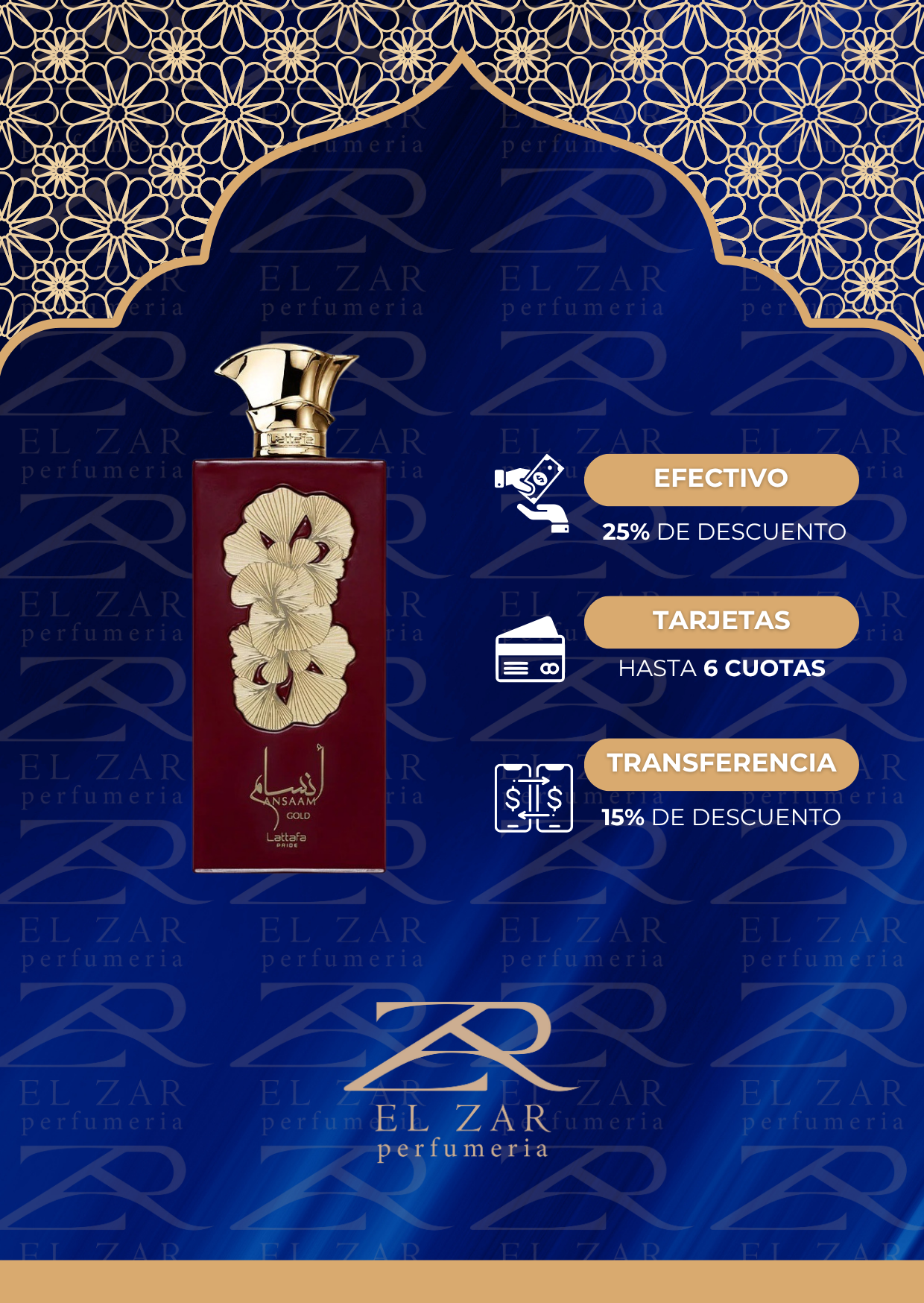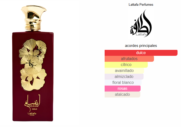 Ansaam Gold de Lattafa Perfumes es una fragancia de la familia olfativa Oriental Floral para Mujeres. Ansaam Gold se lanzó en 2022. Las Notas de Salida son mandarina y pera; las Notas de Corazón son notas dulces, jazmín y rosa; las Notas de Fondo son vainilla, almizcle y frambuesa.
