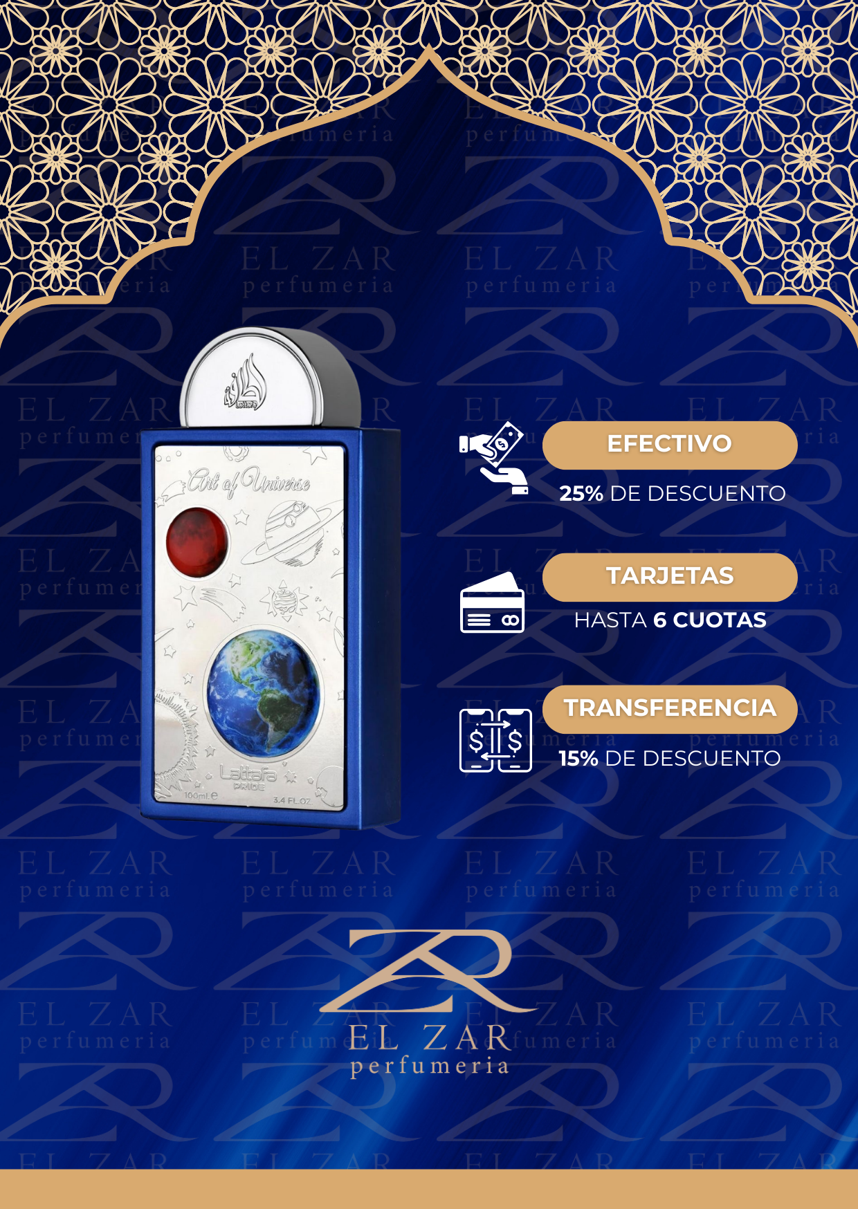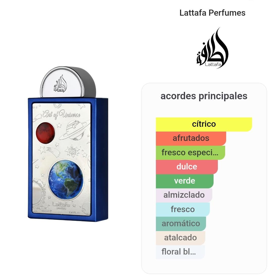 Art Of Universe de Lattafa Perfumes es una fragancia de la familia olfativa Cítrica Aromática para Hombres y Mujeres. Las Notas de Salida son mandarina, jengibre, bergamota y menta; las Notas de Corazón son pera y flor de azahar del naranjo; las Notas de Fondo son almizcle, ámbar y cedro.