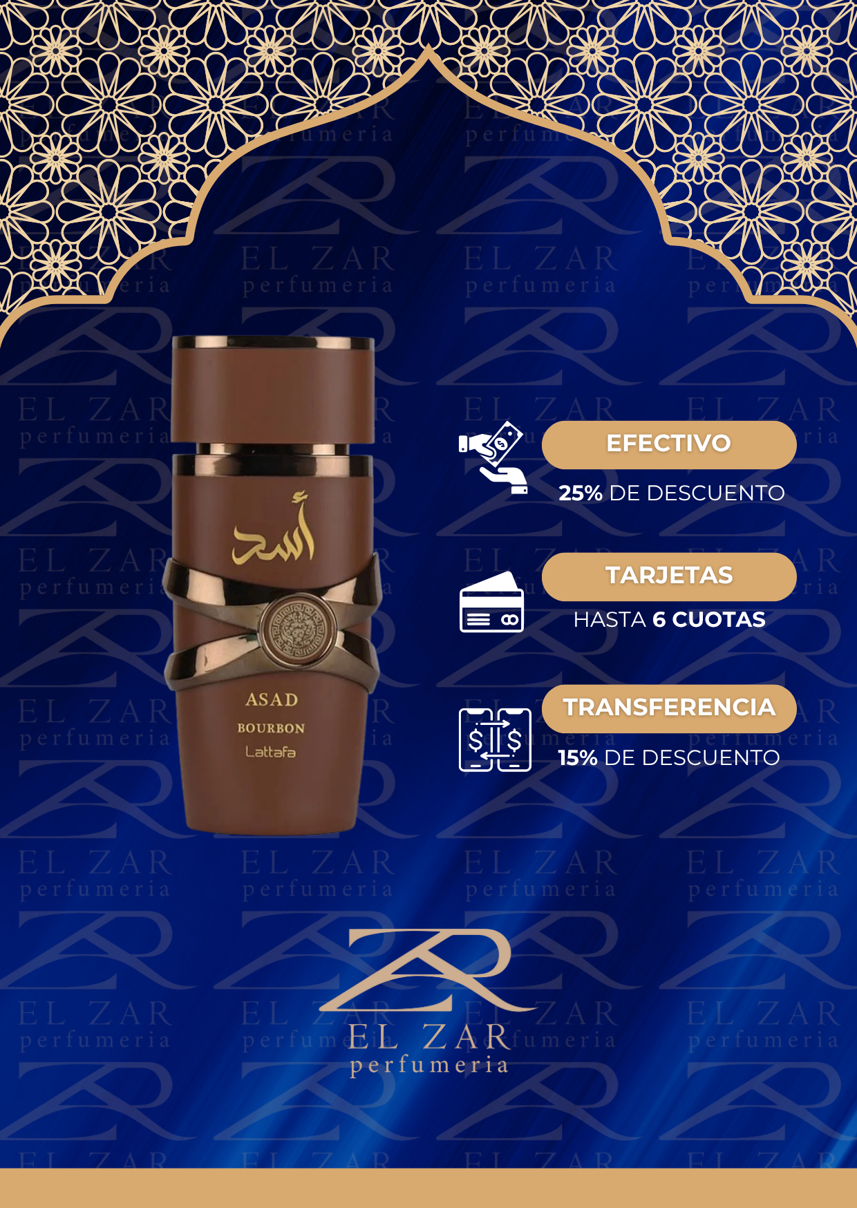 Asad Bourbon de Lattafa Perfumes es una fragancia de la familia olfativa Oriental Especiada para Hombres. Esta fragrancia es nueva. Asad Bourbon se lanzó en 2025. Las Notas de Salida son lavanda, ciruela Mirabel y pimienta rosa; las Notas de Corazón son cacao, nuez moscada y Davana; las Notas de Fondo son vainilla Bourbon, ámbar y vetiver.