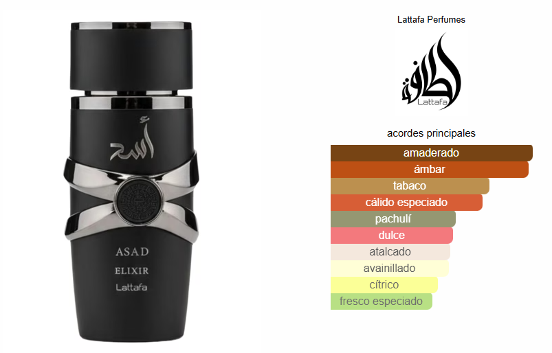 Asad Elixir de Lattafa Perfumes es una fragancia de la familia olfativa Oriental para Hombres. Esta fragrancia es nueva. Asad Elixir se lanzó en 2025. Las Notas de Salida son azafrán, toronja (pomelo) y pimienta rosa; las Notas de Corazón son tabaco, cedro y vainilla; las Notas de Fondo son ámbar ligero, pachulí, Incienso y cachemira.