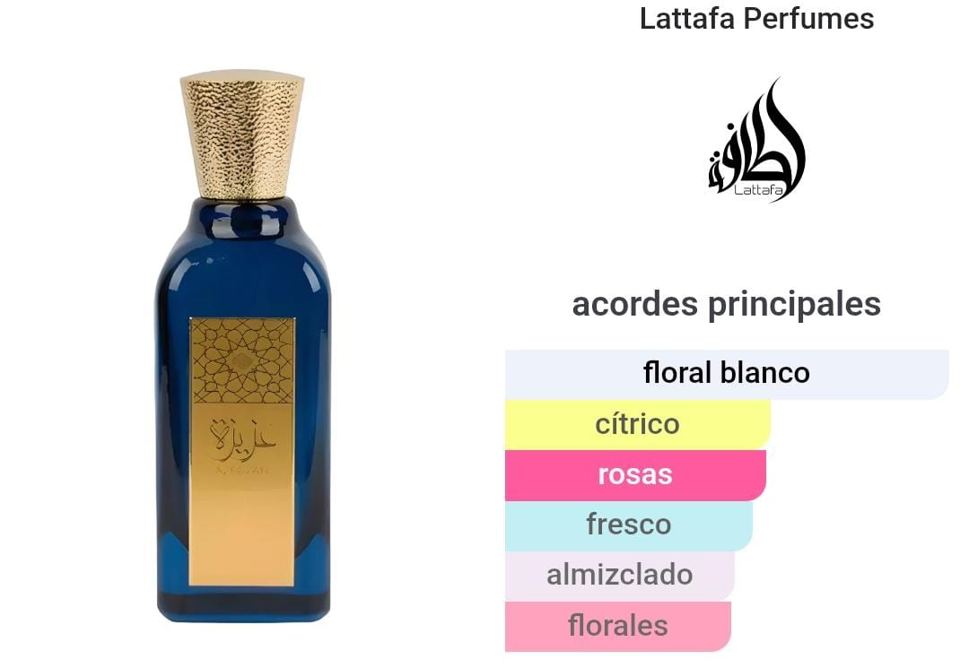 Azeezah de Lattafa Perfumes es una fragancia de la familia olfativa para Hombres y Mujeres. Las Notas de Salida son naranja y cítricos; las Notas de Corazón son jazmín, rosa y lirio de los valles (muguete); la Nota de Fondo es almizcle blanco.