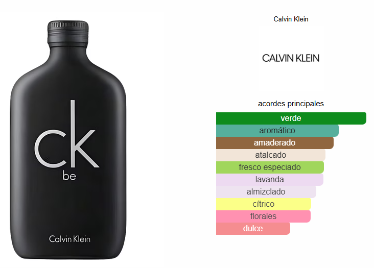 CK be de Calvin Klein es una fragancia de la familia olfativa Almizcle Floral Amaderado para Hombres y Mujeres. CK be se lanzó en 1996. La Nariz detrás de esta fragrancia es René Morgenthaler. Las Notas de Salida son lavanda, notas verdes, bergamota, menta, enebro de Virginia y mandarina; las Notas de Corazón son hierba verde, jazmín, durazno (melocotón), fresia, magnolia y orquídea; las Notas de Fondo son almizcle, sándalo, cedro, vainilla, ámbar y opopónaco.