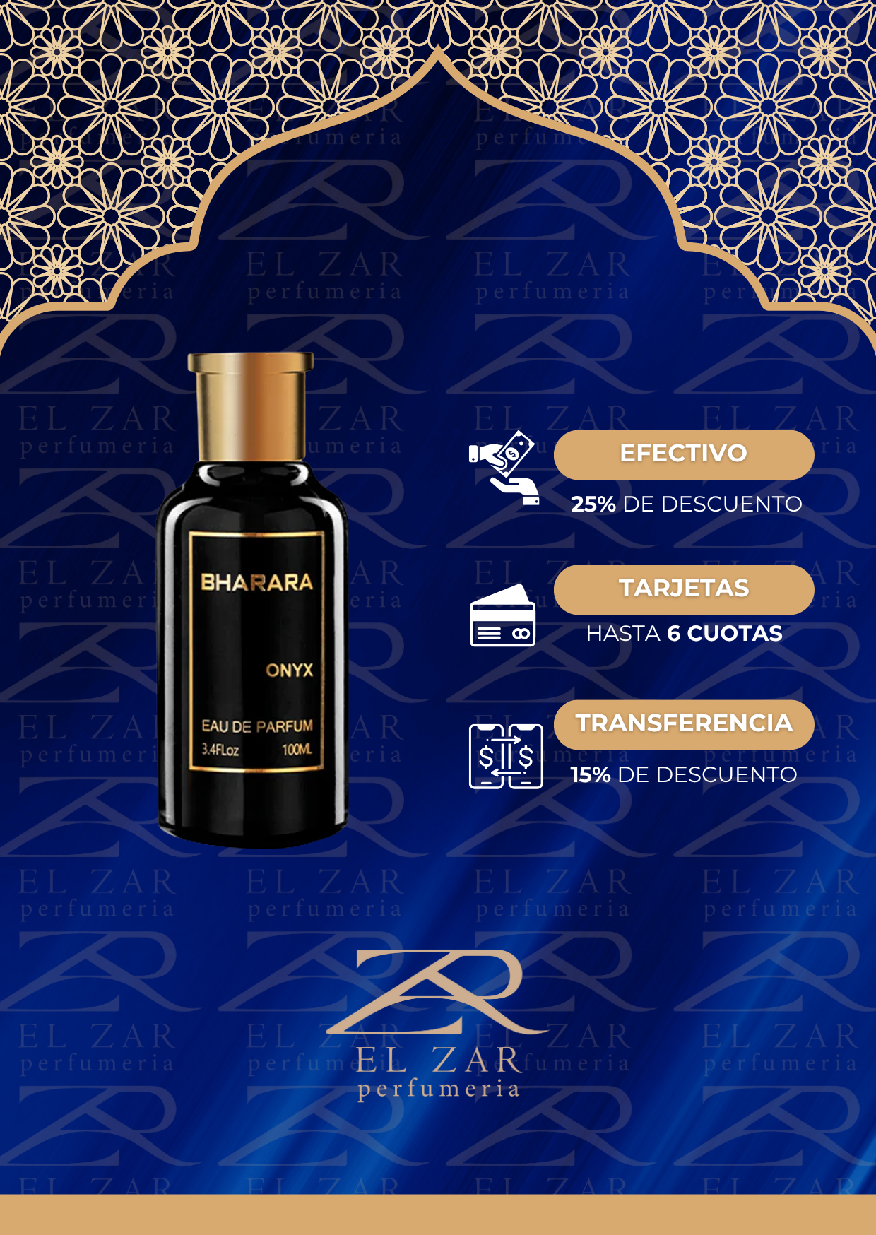Bharara Onyx es una fragancia masculina árabe de la marca Bharara que destaca por su lujo, elegancia y potencia, inspirándose en Lafayette Street de Bond No. 9. Ofrece una mezcla de notas cítricas (bergamota), especiadas (cardamomo) y dulces/amaderadas (vainilla, sándalo, ámbar), con excelente duración y proyección, ideal para hombres que buscan una fragancia sofisticada para ocasiones formales o noches