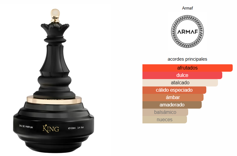 King de Armaf es una fragancia de la familia olfativa Oriental Amaderada para Hombres. Esta fragrancia es nueva. King se lanzó en 2024. Las Notas de Salida son ciruela Mirabel y notas afrutadas; las Notas de Corazón son castaña, Acuerdo goloso y especias; las Notas de Fondo son sándalo, notas atalcadas, ámbar y Notas balsámicas.