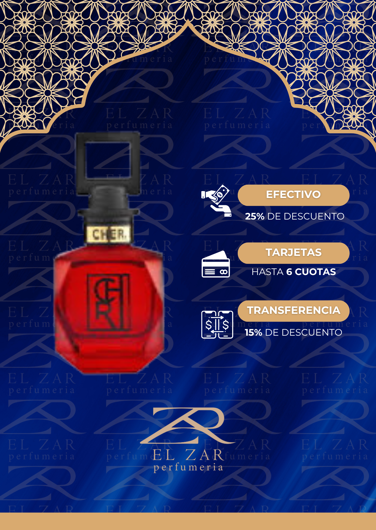 El perfume Cher Onyx Rouge es una fragancia ambarada frutal y gourmand con notas de salida de lichi, hibisco y bayas rojas, un corazón de champagne rosado, jazmín y merengue, y un fondo de cacao, maderas (queenwood) y almizcle (musk), descrito como dulce, vibrante y con una estela provocadora, ideal para primavera/verano y uso diurno, aunque su intensidad y proyección pueden variar según la piel, según varias reseñas de perfumería.