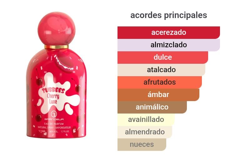 Cherry Luxe de Tubbees es una fragancia de la familia olfativa Oriental Vainilla para Hombres y Mujeres. Las Notas de Salida son cereza, Frutas rojas y heliotropo; las Notas de Corazón son jazmín, haba tonka y sándalo; las Notas de Fondo son almizcle, ámbar gris y vainilla.