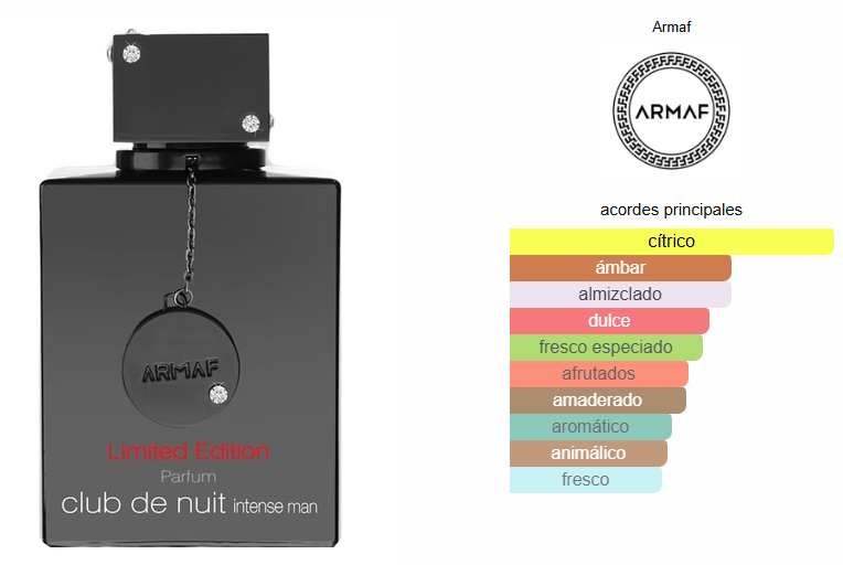 Club de Nuit Intense Man Limited Edition Parfum de Armaf es una fragancia de la familia olfativa para Hombres. Club de Nuit Intense Man Limited Edition Parfum se lanzó en 2021. Las Notas de Salida son limón (lima ácida), piña, lima (limón verde), pimienta negra, bergamota y pimienta rosa; las Notas de Corazón son jazmín, rosa, lirio de los valles (muguete) y fresia; las Notas de Fondo son ambroxan, almizcle blanco, ámbar gris, cedro, cuero y pachulí.