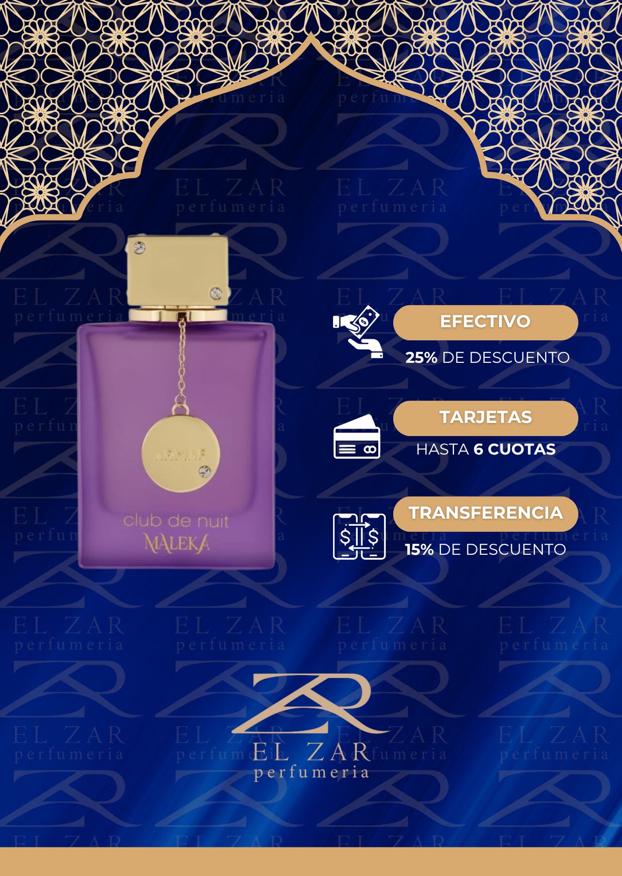 Club De Nuit Maleka de Armaf es una fragancia de la familia olfativa Floral Frutal para Mujeres. Esta fragrancia es nueva. Club De Nuit Maleka se lanzó en 2025. La Nariz detrás de esta fragrancia es Olivier Cresp. Las Notas de Salida son lichi, bergamota y pimienta rosa; la Nota de Corazón es raíz de lirio; las Notas de Fondo son praliné, sándalo y ambroxan.