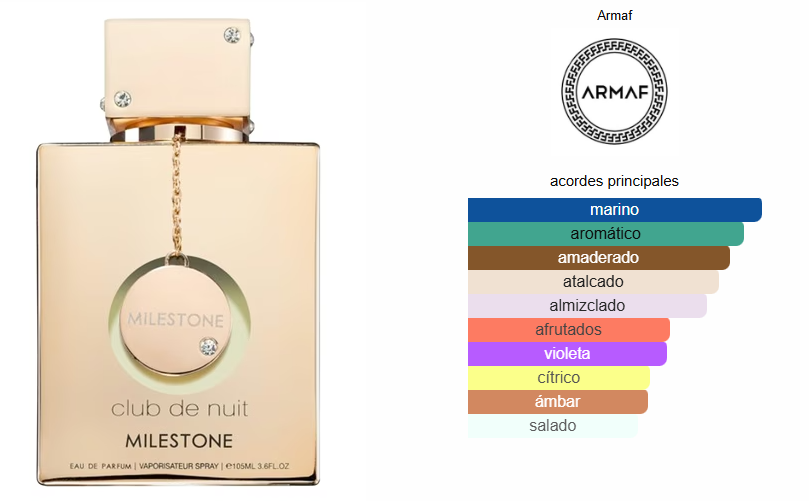 Club de Nuit Milestone de Armaf es una fragancia de la familia olfativa Almizcle Amaderado Floral para Hombres y Mujeres. Club de Nuit Milestone se lanzó en 2019. Las Notas de Salida son notas marinas, Frutas rojas y bergamota; las Notas de Corazón son violeta, maderas blancas y sándalo; las Notas de Fondo son almizcle, ambroxan y vetiver.