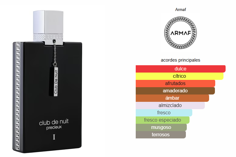 Club de Nuit Precieux I de Armaf es una fragancia de la familia olfativa Oriental Amaderada para Hombres y Mujeres. Esta fragrancia es nueva. Club de Nuit Precieux I se lanzó en 2024. Las Notas de Salida son piña, limón (lima ácida), bergamota, caramelo, pera, pimienta rosa y pimienta negra; las Notas de Corazón son musgo de roble, madera blanca, jazmín, lirio de los valles (muguete) y anís; las Notas de Fondo son ambroxan, almizcle blanco, pachulí, ámbar, vainilla, cuero y cedro.