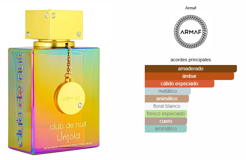 Club de Nuit Untold de Armaf es una fragancia de la familia olfativa para Hombres y Mujeres. Club de Nuit Untold se lanzó en 2022. Las Notas de Salida son azafrán y jazmín; las Notas de Corazón son Amberwood y ámbar gris; las Notas de Fondo son resina de abeto y cedro.