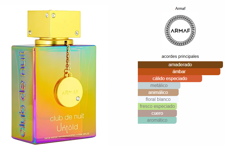Club de Nuit Untold de Armaf es una fragancia de la familia olfativa para Hombres y Mujeres. Club de Nuit Untold se lanzó en 2022. Las Notas de Salida son azafrán y jazmín; las Notas de Corazón son Amberwood y ámbar gris; las Notas de Fondo son resina de abeto y cedro.