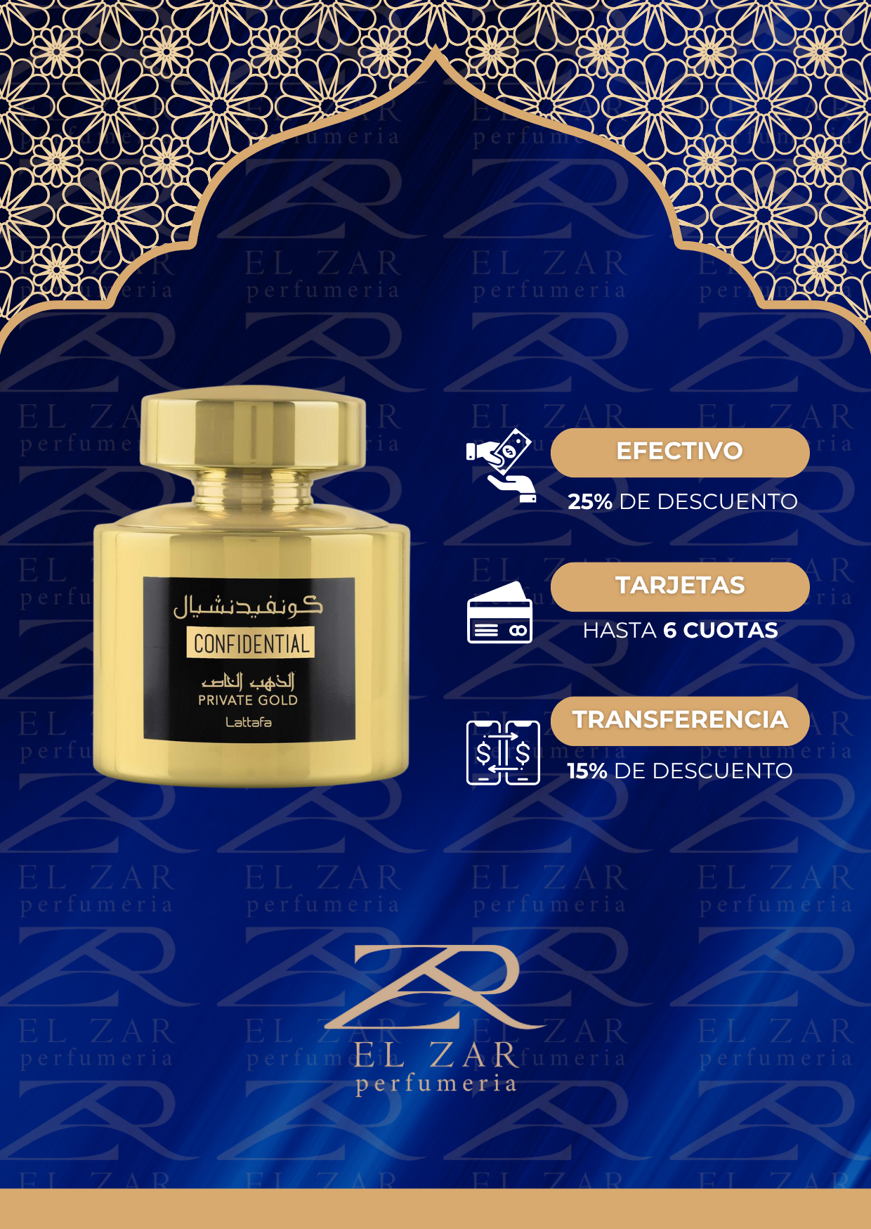 Confidential Private Gold de Lattafa Perfumes es una fragancia de la familia olfativa Chipre Frutal para Hombres y Mujeres. Confidential Private Gold se lanzó en 2020. Las Notas de Salida son durazno (melocotón), pera, maracuyá (fruta de la pasión), frambuesa y casis (grosellero negro); la Nota de Corazón es lirio de los valles (muguete); las Notas de Fondo son almizcle, vainilla, sándalo, pachulí y heliotropo.