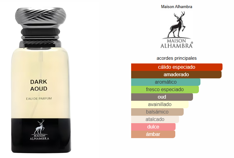 Dark Aoud de Maison Alhambra es una fragancia de la familia olfativa Oriental Amaderada para Hombres y Mujeres. Esta fragrancia es nueva. Dark Aoud se lanzó en 2024. Las Notas de Salida son cardamomo, pimienta y palo de rosa de Brasil; las Notas de Corazón son madera de oud, sándalo y vetiver; las Notas de Fondo son vainilla, haba tonka y ámbar gris.