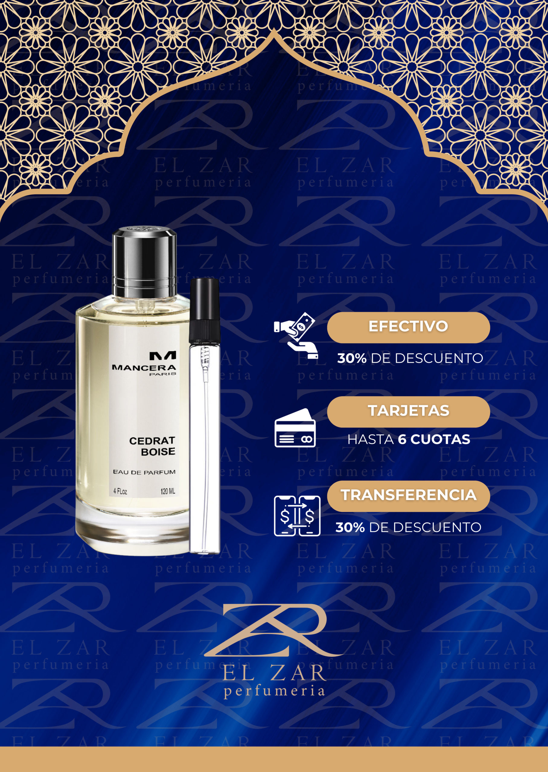 Cedrat Boise de Mancera es una fragancia de la familia olfativa Cítrica Aromática para Hombres y Mujeres. Cedrat Boise se lanzó en 2011. La Nariz detrás de esta fragrancia es Pierre Montale. Las Notas de Salida son limón siciliano (lima siciliana), bergamota, grosellas negras y notas especiadas; las Notas de Corazón son notas afrutadas, hojas de pachulí y jazmín de agua; las Notas de Fondo son cedro, cuero, sándalo, vainilla, almizcle blanco y musgo.