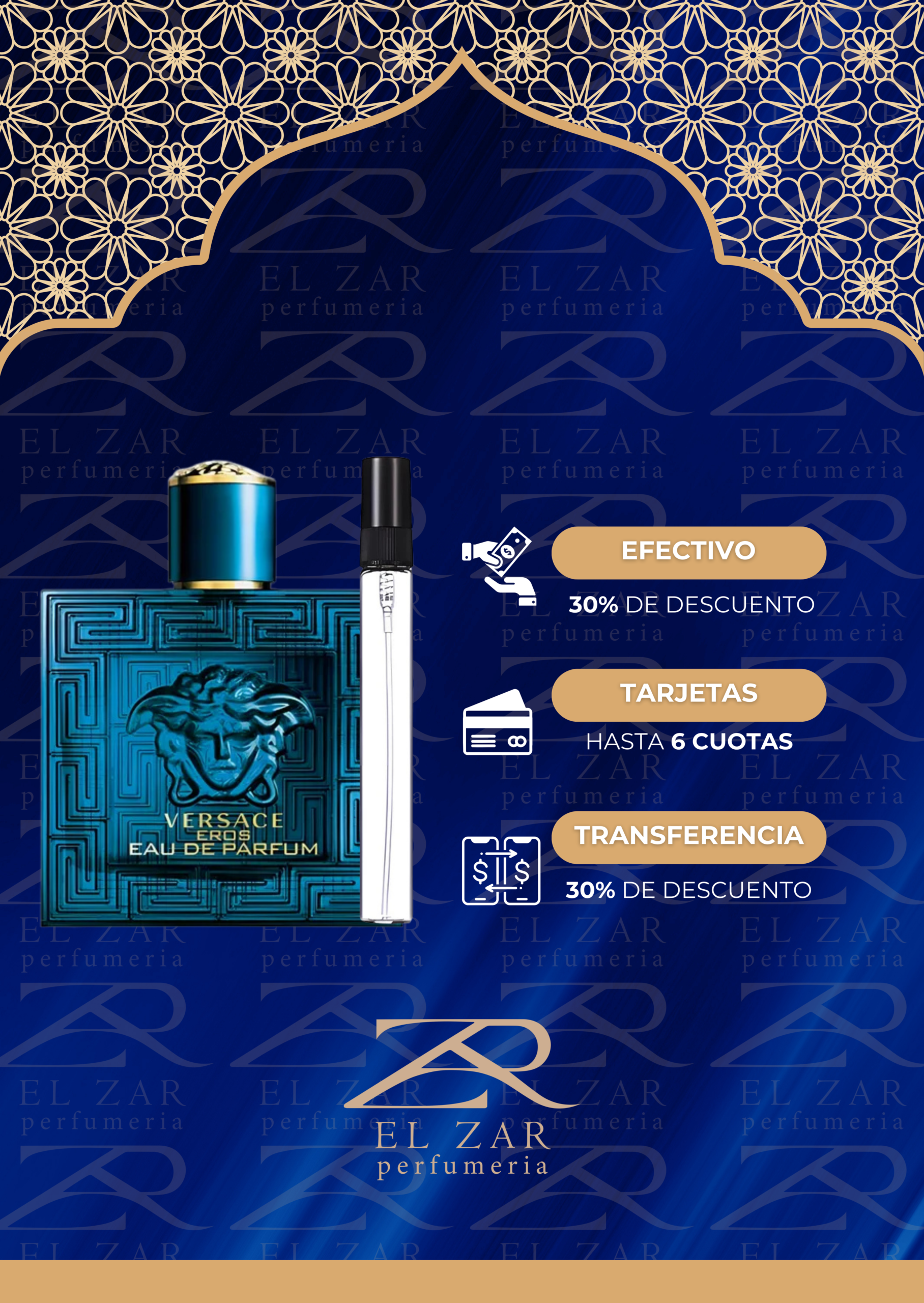 Eros de Versace es una fragancia de la familia olfativa Aromática Fougère para Hombres. Eros se lanzó en 2012. La Nariz detrás de esta fragrancia es Aurélien Guichard. Las Notas de Salida son menta, manzana verde y limón (lima ácida); las Notas de Corazón son haba tonka, ambroxan y geranio; las Notas de Fondo son vainilla de Madagascar, cedro de Virginia, cedro del Atlas, vetiver y musgo de roble.