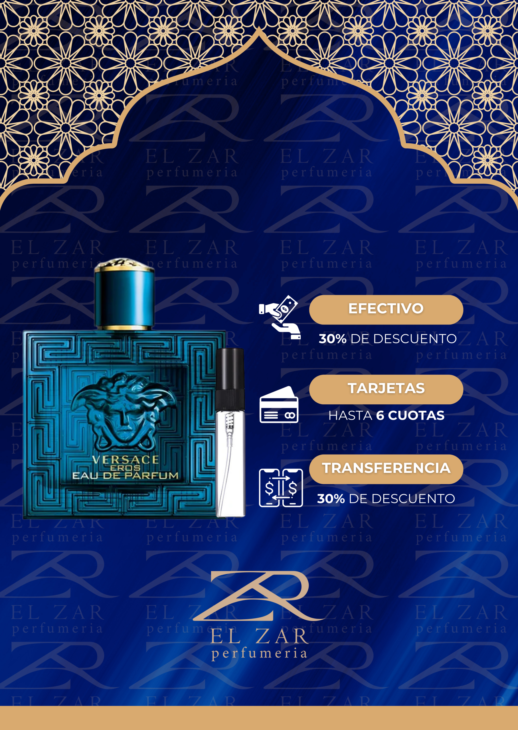Eros de Versace es una fragancia de la familia olfativa Aromática Fougère para Hombres. Eros se lanzó en 2012. La Nariz detrás de esta fragrancia es Aurélien Guichard. Las Notas de Salida son menta, manzana verde y limón (lima ácida); las Notas de Corazón son haba tonka, ambroxan y geranio; las Notas de Fondo son vainilla de Madagascar, cedro de Virginia, cedro del Atlas, vetiver y musgo de roble.
