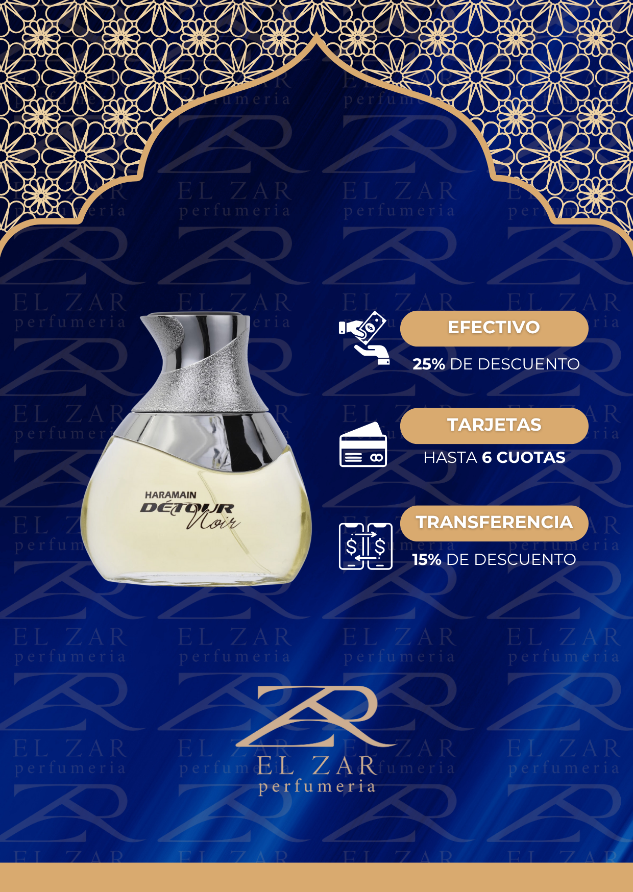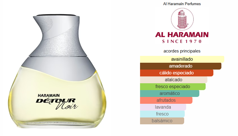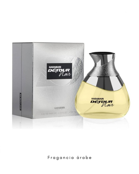 Détour Noir de Al Haramain Perfumes es una fragancia de la familia olfativa Oriental Especiada para Hombres y Mujeres. Détour Noir se lanzó en 2021. Las Notas de Salida son manzana, lavanda, jazmín y violeta; las Notas de Corazón son vainilla, pachulí, bergamota y mandarina; las Notas de Fondo son sándalo, cardamomo, pimienta, madera de gaiac y geranio.
