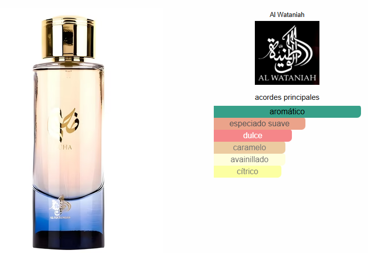 Duha de Al Wataniah es una fragancia de la familia olfativa Oriental Amaderada para Mujeres. Duha se lanzó en 2021. Las Notas de Salida son esclarea y naranja tangerina; las Notas de Corazón son haba tonka y caramelo; la Nota de Fondo es vetiver.
