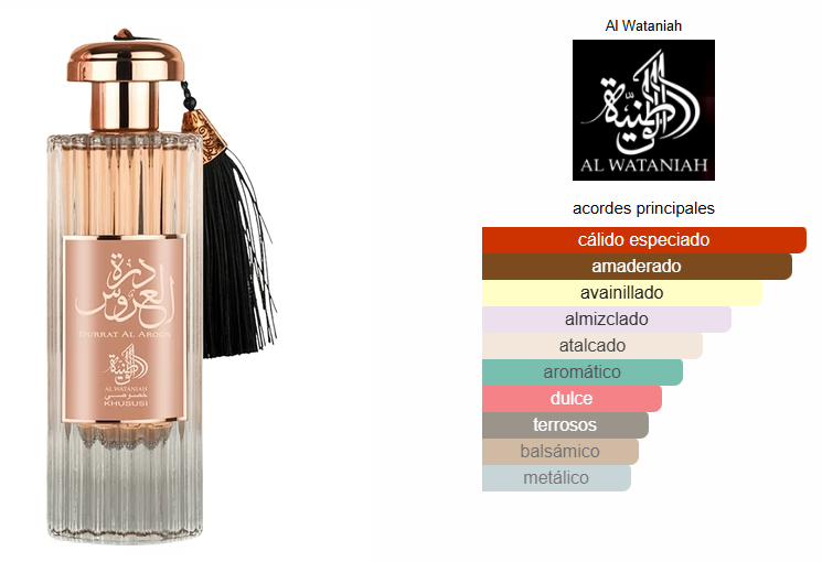 Durrat Al Aroos de Al Wataniah es una fragancia de la familia olfativa Oriental para Mujeres. Durrat Al Aroos se lanzó en 2022. Las Notas de Salida son almizcle blanco y cipriol (nagarmota); las Notas de Corazón son vainilla, cardamomo y azafrán; las Notas de Fondo son madera de gaiac y cumarina.