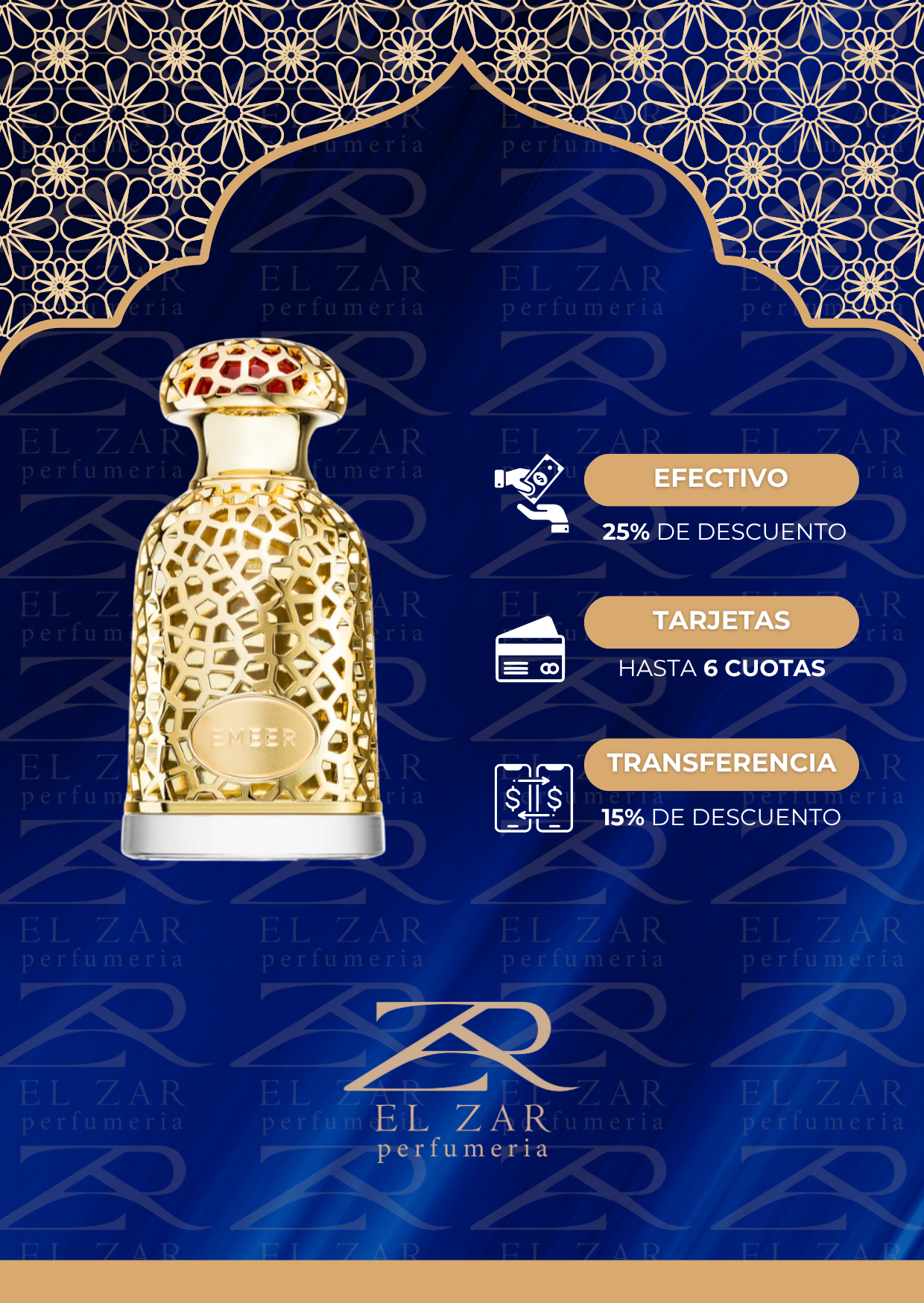 Emeer de Lattafa Perfumes es una fragancia de la familia olfativa Amaderada Aromática para Hombres y Mujeres. Esta fragrancia es nueva. Emeer se lanzó en 2024. Las Notas de Salida son limón (lima ácida), bergamota, esclarea y bayas de enebro; las Notas de Corazón son té Blanco, sándalo, cardamomo y incienso de olíbano (franquincienso); las Notas de Fondo son ámbar gris, cedro, cachemira y pachulí.