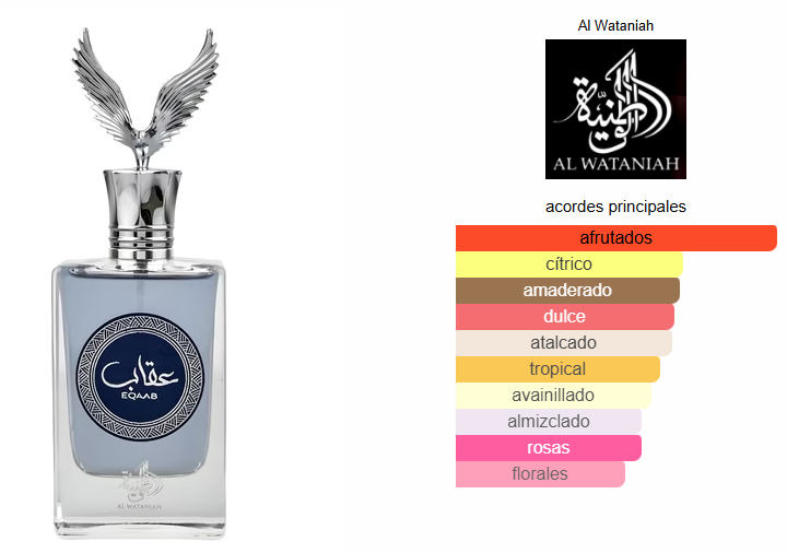 Eqaab de Al Wataniah es una fragancia de la familia olfativa Amaderada Aromática para Hombres. Eqaab se lanzó en 2023. Las Notas de Salida son mandarina, mango y grosellas negras; las Notas de Corazón son rosa, jazmín y almendra; las Notas de Fondo son vainilla, sándalo y almizcle.