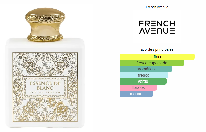 Essence de Blanc de French Avenue es una fragancia de la familia olfativa Aromática para Hombres y Mujeres. Essence de Blanc se lanzó en 2022. Las Notas de Salida son petit grain, bergamota, cítricos y naranja; las Notas de Corazón son jengibre, menta y notas especiadas; las Notas de Fondo son Flores transparentes, Notas acuáticas y ámbar gris.
