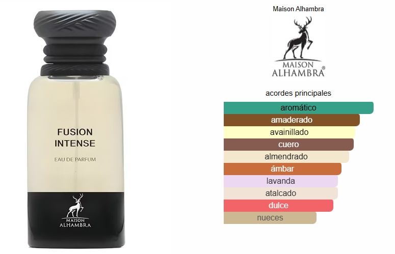 Fusion Intense de Maison Alhambra es una fragancia de la familia olfativa Cuero para Hombres y Mujeres. Esta fragrancia es nueva. Fusion Intense se lanzó en 2024. Las Notas de Salida son lavanda y esclarea; las Notas de Corazón son almendra amarga, cuero, iris y vainilla; las Notas de Fondo son cuero, haba tonka, maderas blancas, cachemira y ámbar.