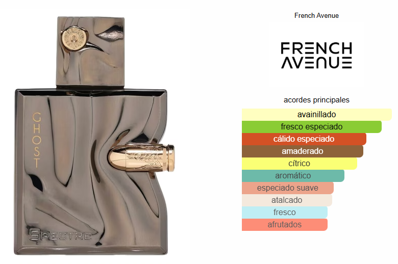Spectre Ghost de French Avenue es una fragancia de la familia olfativa Amaderada Aromática para Hombres. Spectre Ghost se lanzó en 2023. Las Notas de Salida son jengibre, cardamomo y bergamota; las Notas de Corazón son pimienta rosa, grosellas negras y rosa; las Notas de Fondo son vainilla, cedro y pachulí.