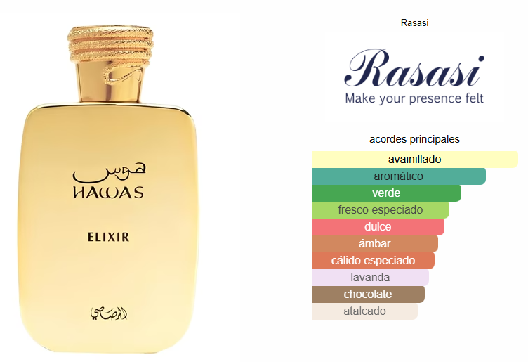 Hawas Elixir de Rasasi es una fragancia de la familia olfativa Oriental Vainilla para Hombres y Mujeres. Esta fragrancia es nueva. Hawas Elixir se lanzó en 2024. Las Notas de Salida son menta, bergamota y abrótano; las Notas de Corazón son chocolate oscuro, lavanda y benjuí; las Notas de Fondo son vainilla, haba tonka y almizcle blanco.