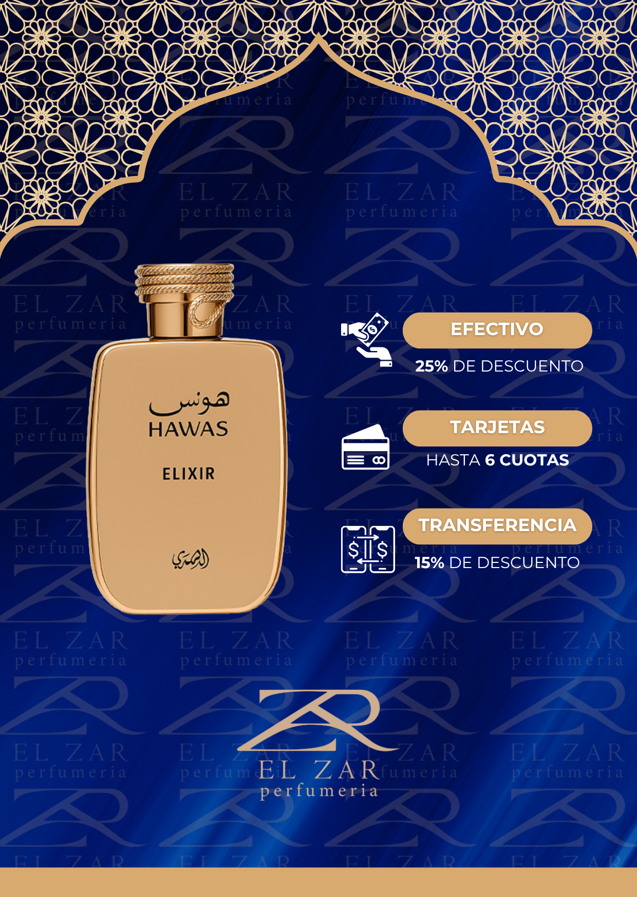 Hawas Elixir de Rasasi es una fragancia de la familia olfativa Oriental Vainilla para Hombres y Mujeres. Esta fragrancia es nueva. Hawas Elixir se lanzó en 2024. Las Notas de Salida son menta, bergamota y abrótano; las Notas de Corazón son chocolate oscuro, lavanda y benjuí; las Notas de Fondo son vainilla, haba tonka y almizcle blanco.