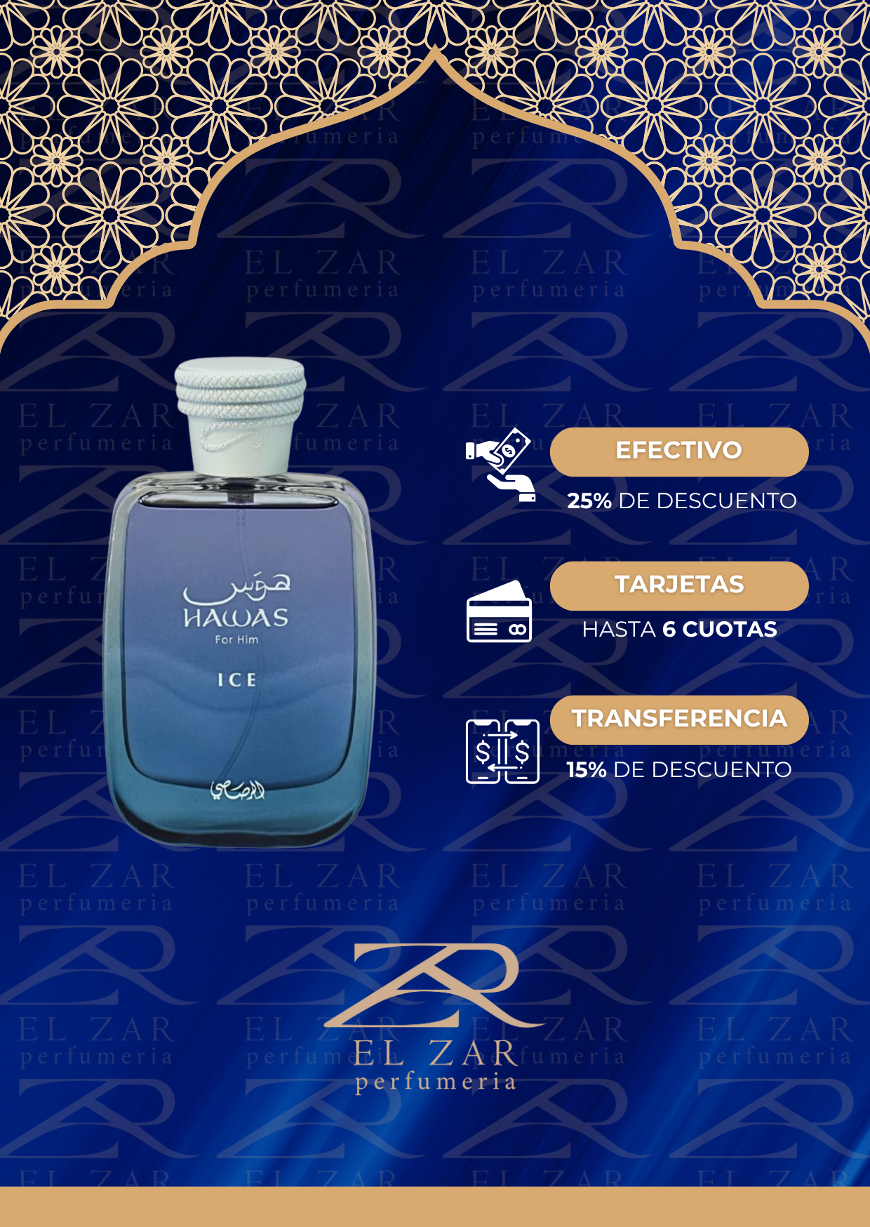 Hawas Ice de Rasasi es una fragancia de la familia olfativa Aromática para Hombres. Hawas Ice se lanzó en 2023. Las Notas de Salida son manzana, limón italiano (lima italiana), bergamota de Sicilia y anís estrellado; las Notas de Corazón son ciruela, flor de azahar del naranjo y cardamomo; las Notas de Fondo son almizcle, ámbar, trozos de madera a la deriva y musgo.