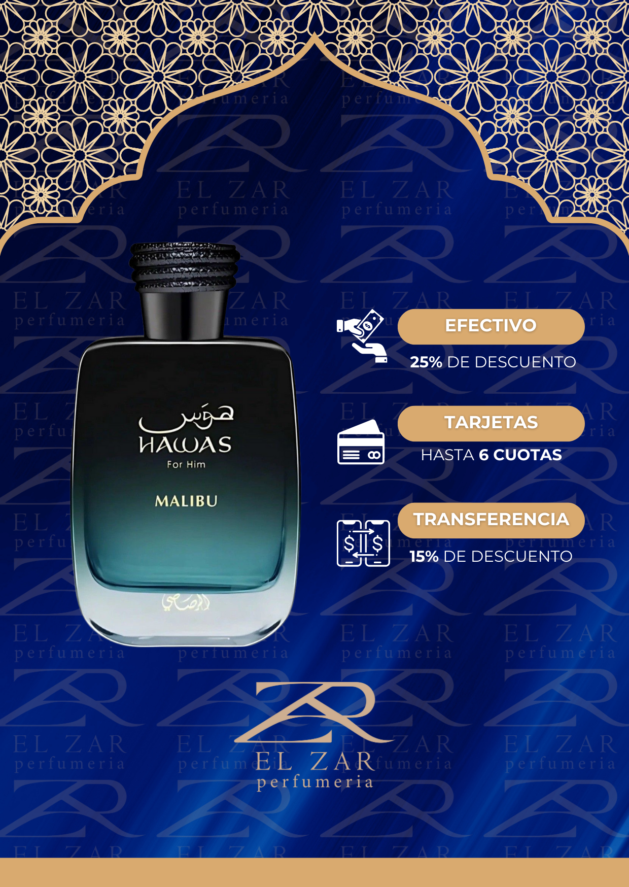Hawas Malibu de Rasasi es una fragancia de la familia olfativa Aromática para Hombres y Mujeres. Esta fragrancia es nueva. Hawas Malibu se lanzó en 2025. Las Notas de Salida son piña, naranja y toronja (pomelo); las Notas de Corazón son raíz de lirio, ámbar y lavanda; las Notas de Fondo son haba tonka, almizcle, cachemira y pachulí.