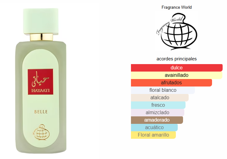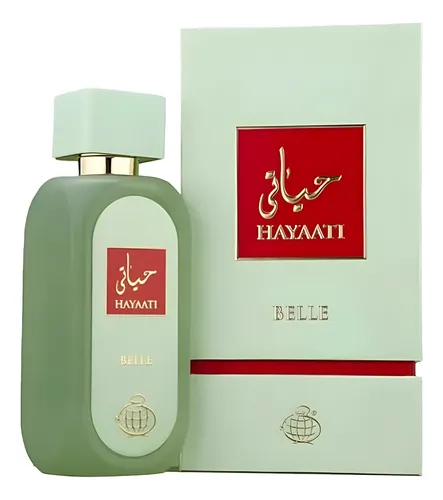 Hayaati Belle de Fragrance World es una fragancia de la familia olfativa Floral Frutal para Mujeres. Esta fragrancia es nueva. Hayaati Belle se lanzó en 2024. Las Notas de Salida son pera y durazno (melocotón); las Notas de Corazón son haba tonka, jazmín, ylang-ylang y lirio de los valles (muguete); las Notas de Fondo son vainilla, almizcle y notas amaderadas.