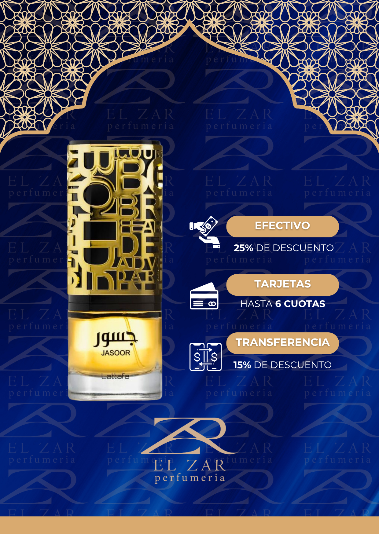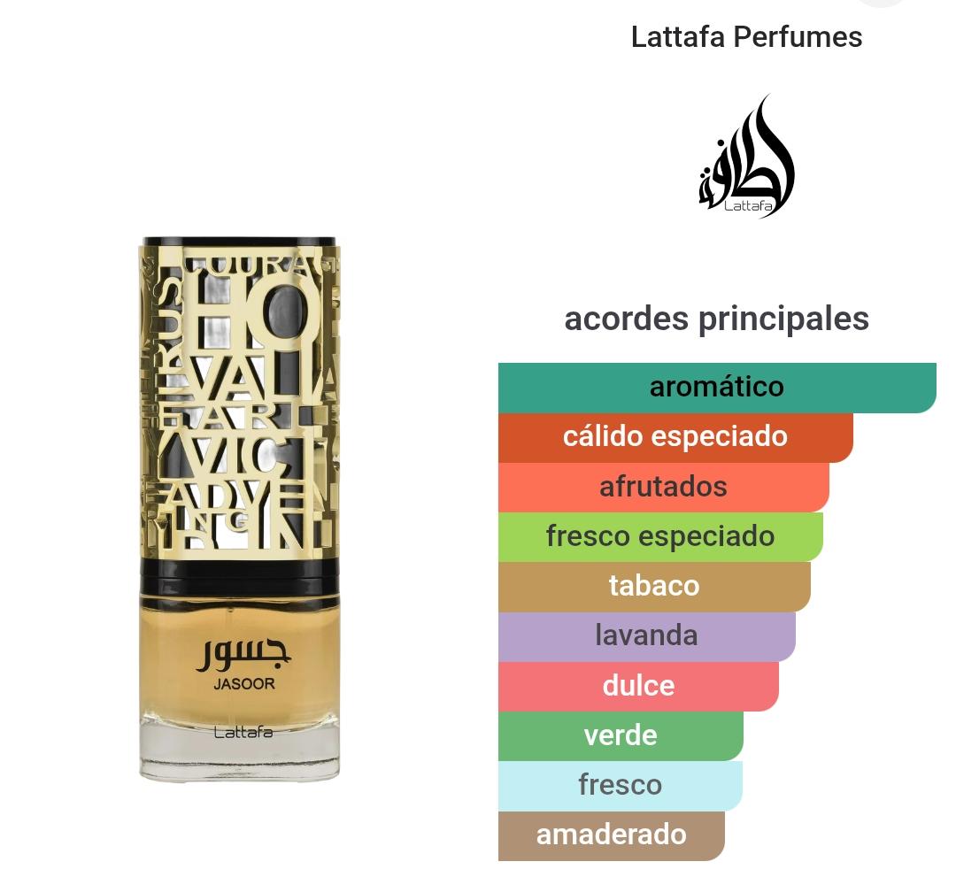Jasoor de Lattafa Perfumes es una fragancia de la familia olfativa para Hombres y Mujeres. Las Notas de Salida son manzana, cardamomo y bergamota; las Notas de Corazón son tabaco, lavanda y geranio; las Notas de Fondo son haba tonka, cuero, vetiver y pachulí.