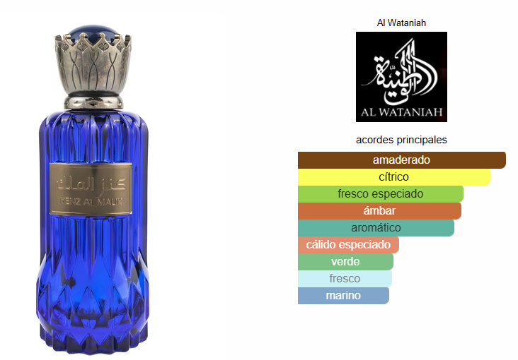 Kenz Al Malik de Al Wataniah es una fragancia de la familia olfativa Amaderada Especiada para Hombres. Kenz Al Malik se lanzó en 2022. Las Notas de Salida son toronja (pomelo), pimienta rosa, vetiver, bergamota, notas marinas y limón (lima ácida); las Notas de Corazón son toronja (pomelo), jengibre, cedro, menta, ládano, nuez moscada y jazmín; las Notas de Fondo son jengibre, Amberwood, incienso y sándalo.