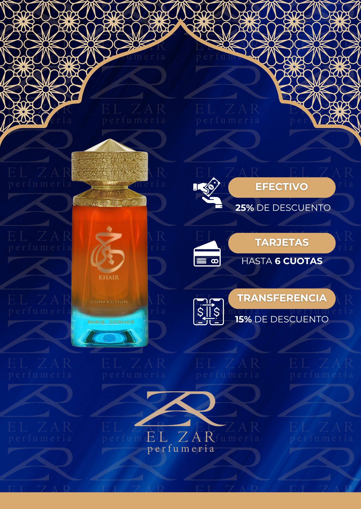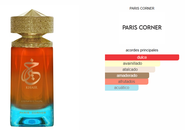 Khair Confection de PARIS CORNER es una fragancia de la familia olfativa Floral Frutal Gourmand para Mujeres. Esta fragrancia es nueva. Khair Confection se lanzó en 2024. Las Notas de Salida son pera y crema batida; las Notas de Corazón son cachemira, jazmín y ylang-ylang; las Notas de Fondo son vainilla, malvavisco (bombón) y sándalo.