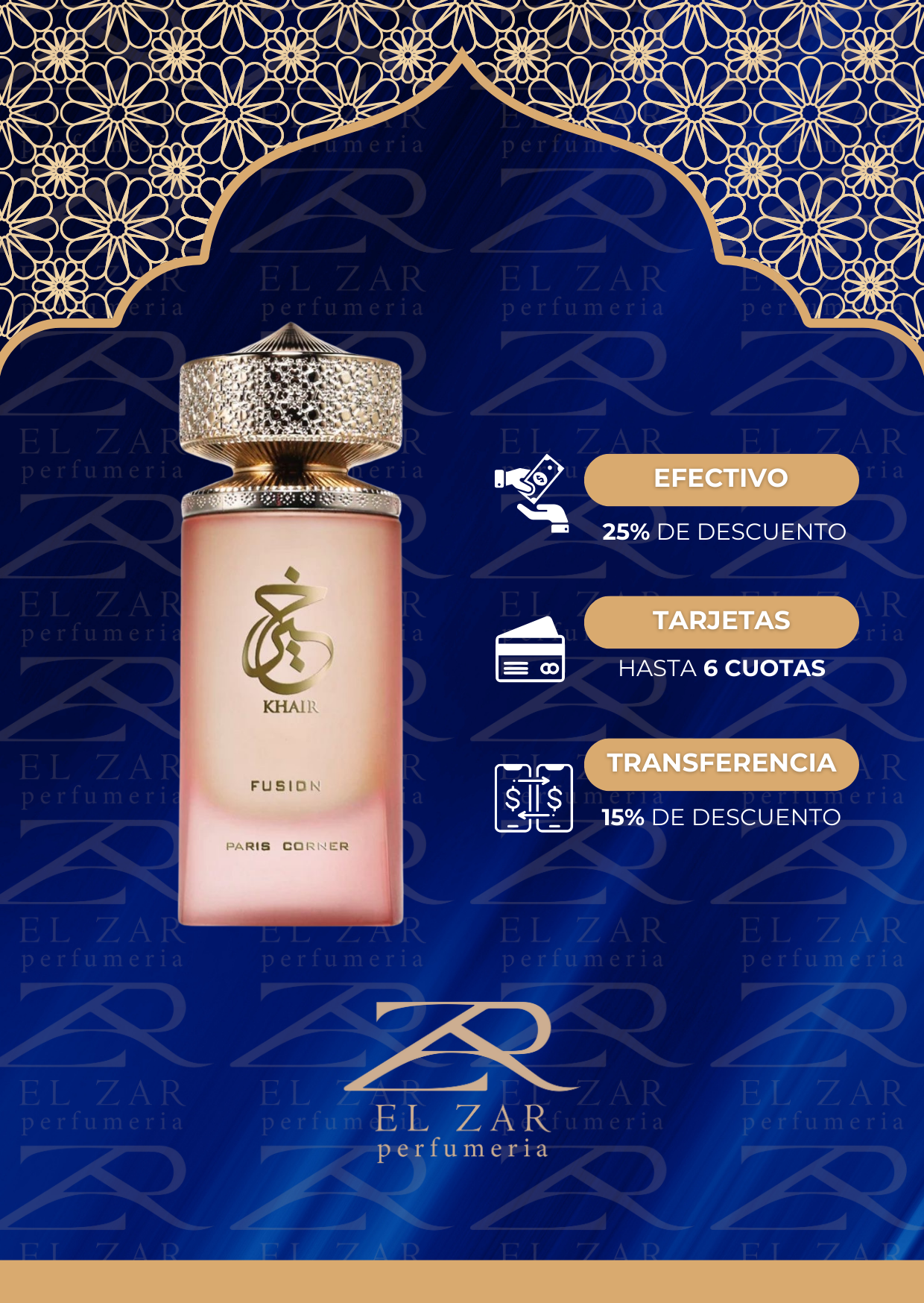 Khair Fusion de PARIS CORNER es una fragancia de la familia olfativa Floral Frutal para Hombres y Mujeres. Khair Fusion se lanzó en 2023. Las Notas de Salida son lichi, manzana roja, grosellas negras y limón italiano (lima italiana); las Notas de Corazón son jazmín sambac (sampaguita), rosa de Taif y pensamiento; las Notas de Fondo son vainilla, vainilla, almizcle, sándalo y cedro.